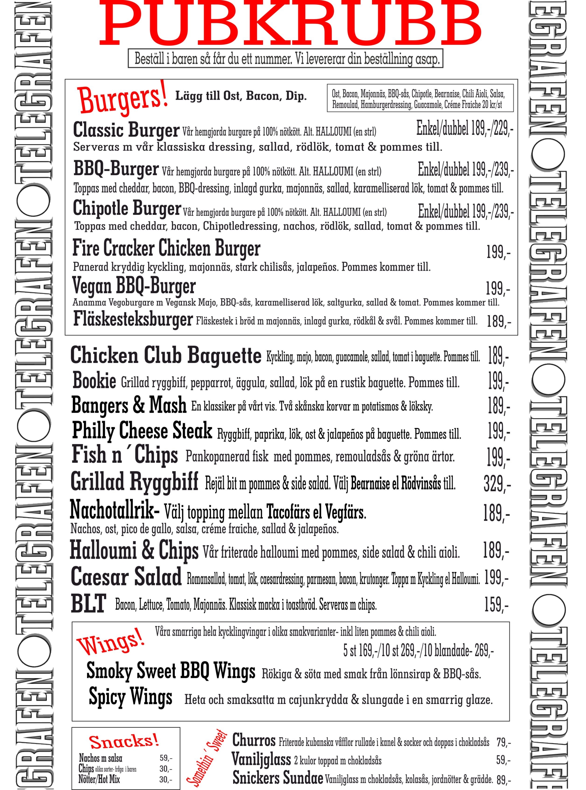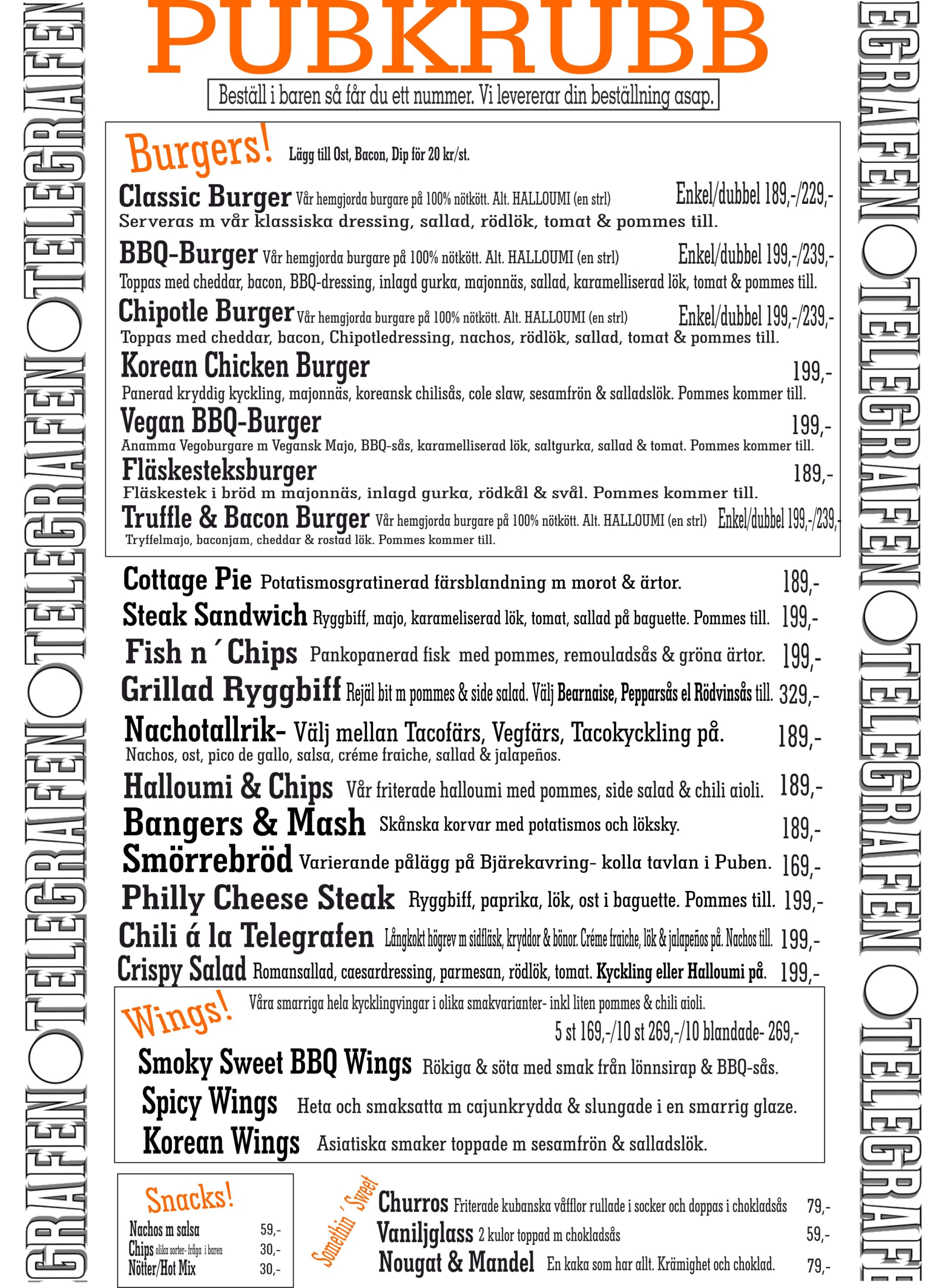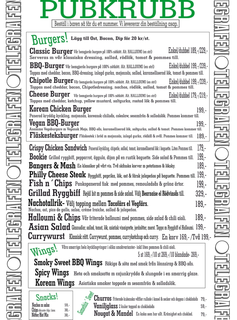 Pubkrubb kallar vi vår meny, en varierad sådan, som är inspirerad från alla världens hörn, med något för alla. Det som utmärker vår pubmat är att vi vet vad den innehåller. Vi lagar i princip allt från grunden. Det gör att vi minimerar riskerna för e-nummer och annat skräp. Vi har således även koll på allergener och spårbarhet. Det tycker vi är skönt.